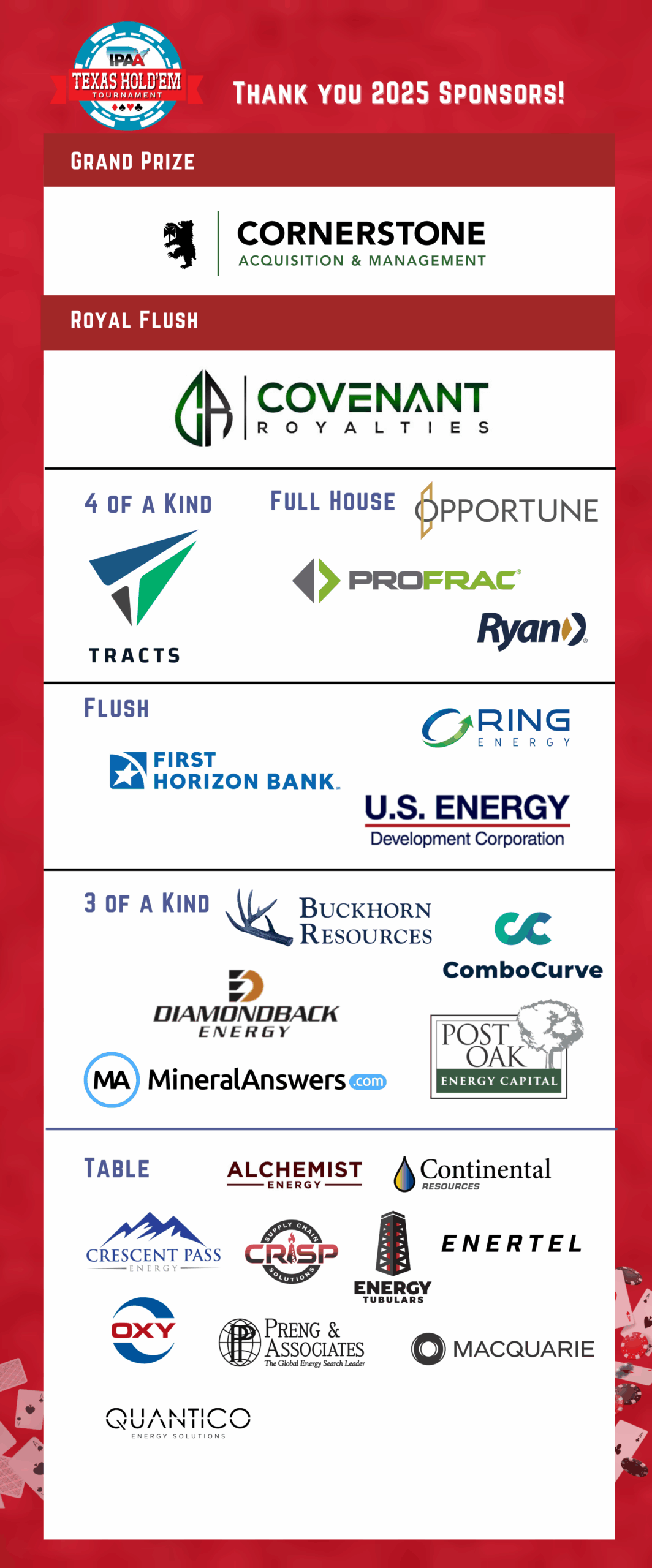 Join IPAA as a partner for our 8th Annual Texas Hold’em Tournament —a premier fundraising and networking event supporting IPAA and its members’ ongoing efforts to champion America’s oil and natural gas industry. Don’t miss this exciting opportunity to connect and make an impact!
